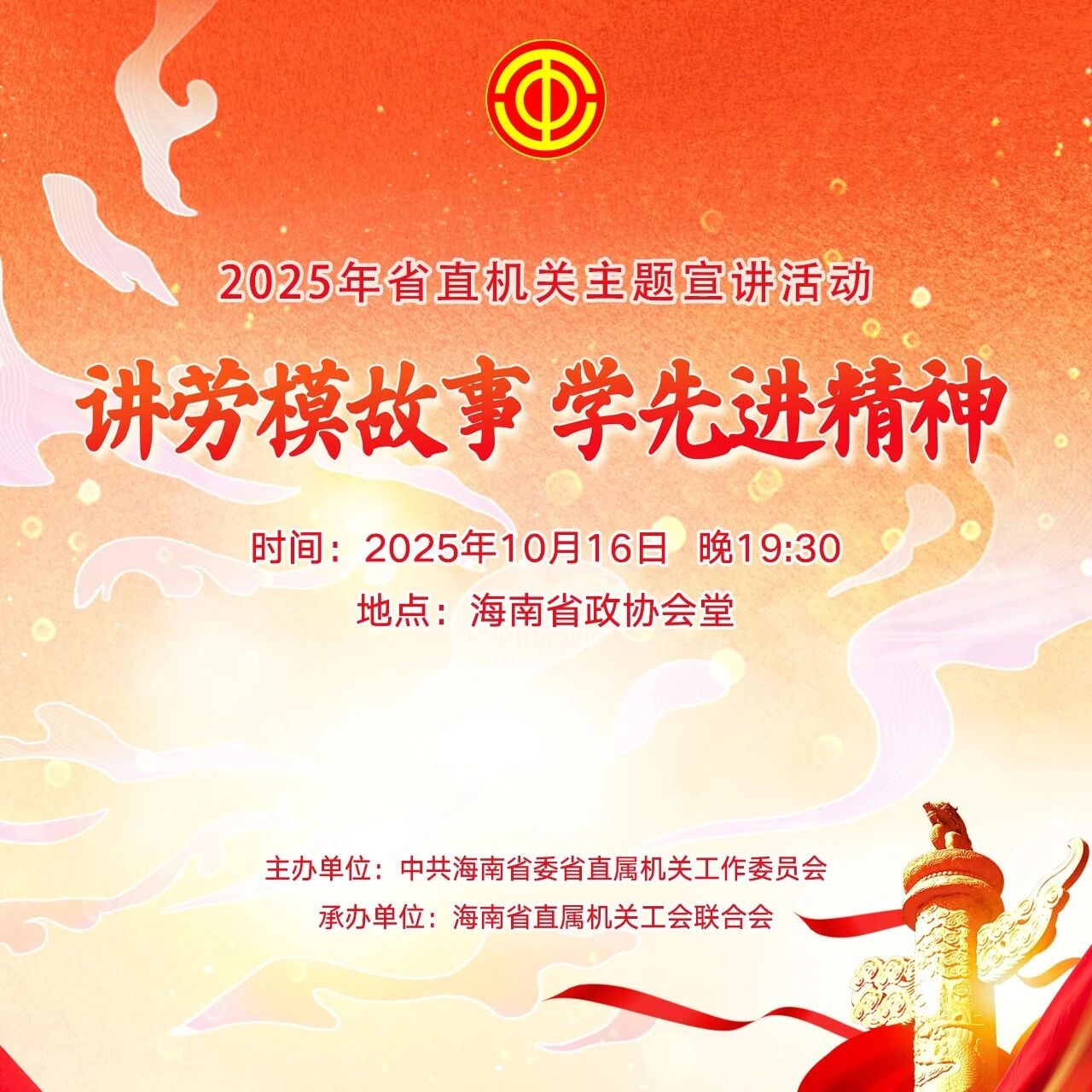 | 为深入贯彻落实习近平总书记关于大力弘扬劳模精神、劳动精神、工匠精神的重要指示精神,省委省直机关工委将于2025年10月16日19:30组织开展省直机关“讲劳模故事、学先进精神”主题宣讲活动,旨在通过主题宣讲的方式营造劳动光荣的工作氛围,增强省直机关干部职工对劳动价值的尊重和认同,提升省直机关干部职工凝聚力和战斗力,为加快推进海南自贸港建设提供有力保障。活动时间2025年10月16日(星期四)19:30-21:00活动地点省政协会堂(海南广场9号楼)END▍来源:海南省总工会部... |
