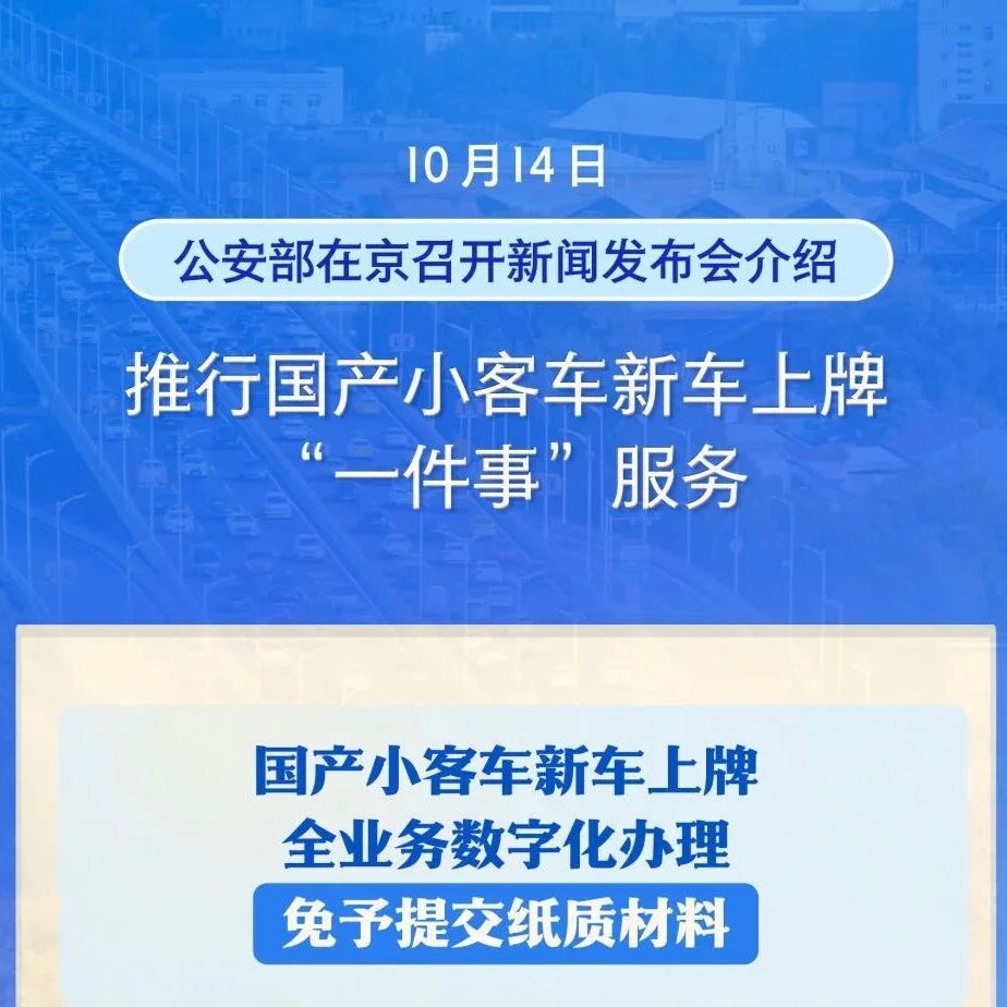 | 新华社权威快报|11月1日全面推行!国产小客车新车上牌不用再跑车管所公安部10月14日在京召开新闻发布会介绍,11月1日起在全国全面推行国产小客车新车上牌“一件事”服务,推动车辆销售发票、购置税、保险等信息共享核查,实现国产小客车新车上牌全业务数字化办理,群众免予提交纸质材料。同时,在“交管12123”App开发应用新车上牌模块,网上集成选车、购险链接和选号、上牌等服务,实现新车信息联网共享,群众购置新车后不需要再到车管所验车,足不出户网办登记上牌。据了解,... |