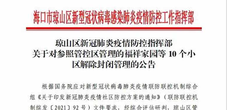 今日14时起,海口福祥家园等10个小区解除封闭管理→