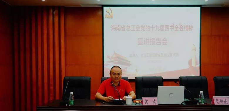 为让广大职工深入学习宣传贯彻落实党的十九届四中全会精神,2019年11月27日上午,省总工会党组成员、副主席何清到琼海市自来水公司宣讲党的十九届四中全会精神,琼海市总工会党组书记、常务副主席曾绍宬主席主持宣讲报告会。