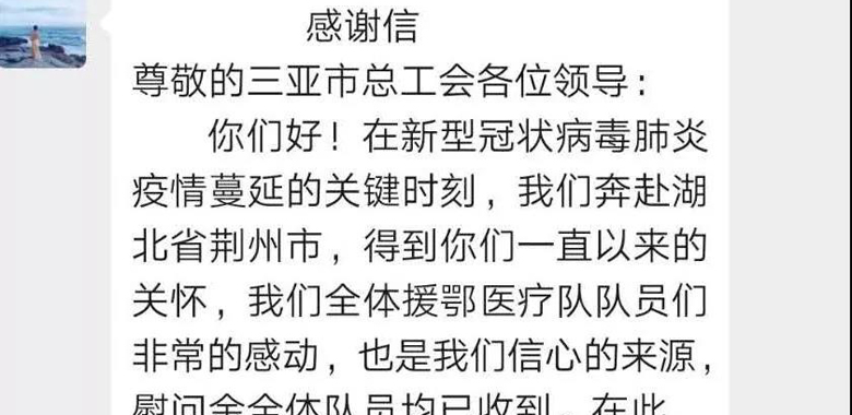 2月18日,三亚市总工会收到了一封来自三亚市中心医院援鄂医疗队的感谢信。表达了对市总工会慰问的感谢和战胜新冠肺炎的坚定决心。