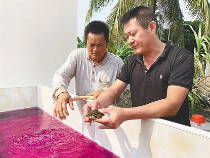 振兴乡村,产业是关键。2017年9月,黎盆村成立了陵水兴盛达农业发展有限公司,通过“产养结合、种养结合”,打造黎盆特色产业。孙凤龙带着工作团队和村两委班子成员经过多方听取介绍、实地考察、调查论证,把目光锁定在山水龟养殖产业上。“山水龟养殖业门槛低、投入少、见效快、产值高,既可以规模化发展又适合家庭个体养殖。”孙凤龙介绍。