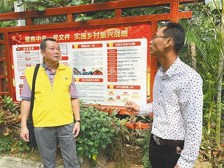 南湾村乡村振兴工作队队长钟伟(左)正在跟村干部探讨产业发展规划。
