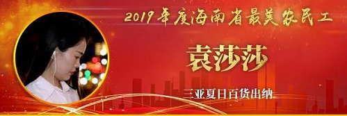 出身普通农民家庭的袁莎莎在三亚夏日百货先后任收银员、出纳等职。她秉持着“小岗位,大思想”的观念,在2014年全国第六届“银联杯”比赛中,代表海南获得全国赛区优秀个人三等奖及“全国商业服务业技术能手”称号,为海南省选手历年来最好成绩。后来又通过“求学圆梦行动”取得大专学历,并坚持自学外语以便服务国外旅客。追梦不休,奋斗不止。90后的“夏日女孩”袁莎莎如三亚的阳光般热情而又灿烂。