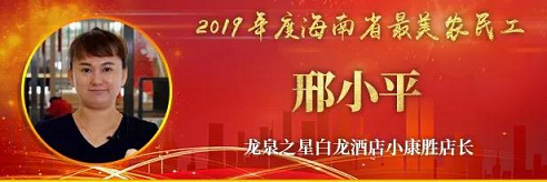 白龙酒店小康胜店长邢小平,一个热情温暖的文昌姑娘。作为企业的一名员工,她善于发现问题、解决问题,自接手店里外卖外带项目以来,隔年实现外卖创收倍增。作为一名店长,她始终坚持以“自身模范”去要求自己,用自己的实际行动去影响和带动全体员工。在工作和生活中经常给予他们关心。四年来,她管理的员工队伍没有一个人离职,并且在集团的优质服务月快餐事业部的比赛中,服务组连续四年荣获第一名。