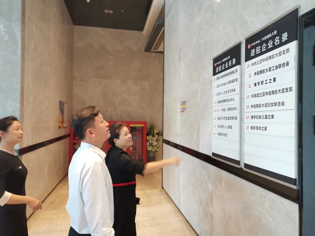 11月9日上午,省总工会党组成员、副主席王裕明到三亚市中信南航大厦调研指导楼宇工会职工之家建设工作。三亚市总工会党组副书记、常务副主席周月霞,市总工会党组成员、经审委主任张华,中信南航楼宇工会负责人陪同调研。