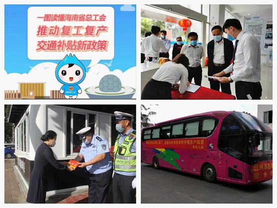 2月28日,海南省总工会出台了协助企业复工复产、推动稳岗就业、关爱一线防控人员、扩大交通补贴范围等十条措施,团结动员广大职工凝心聚力共克时艰,全力支持企业科学精准防疫、有序复工复产,推动构建和谐稳定的劳动关系。