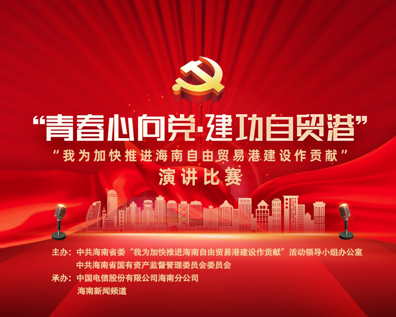 为深入学习贯彻习近平总书记关于推进海南自由贸易港建设的重要指示和《海南自由贸易港建设总体方案》精神,根据省委办公厅和省政府办公厅印发《“我为加快推进海南自由贸易港建设作贡献”活动实施方案》的要求和省委贡献办的文件《关于开展“我为加快推进海南自由贸易港建设作贡献”演讲比赛的通知》,经研究,省国资委党委决定举办海南省国资系统“青春心向党·建功自贸港”—“我为加快推进海南自由贸易港建设作贡献”演讲比赛。11月25日,由中共海南省委“我为加快推进海南自由贸易港建设作贡献”活动领导小组办公室、中共海南省国有资产监督管理委员会委员会主办,中国电信股份有限公司海南分公司、海南新闻频道承办的海南省国资系统“青春心向党·建功自贸港”—“我为加快推进海南自由贸易港建设作贡献”演讲比赛在中国电信海南公司二楼多功能厅举行。来自中央驻琼企业、省属重点监管企业的负责同志、干部职工和参赛选手参加活动。
