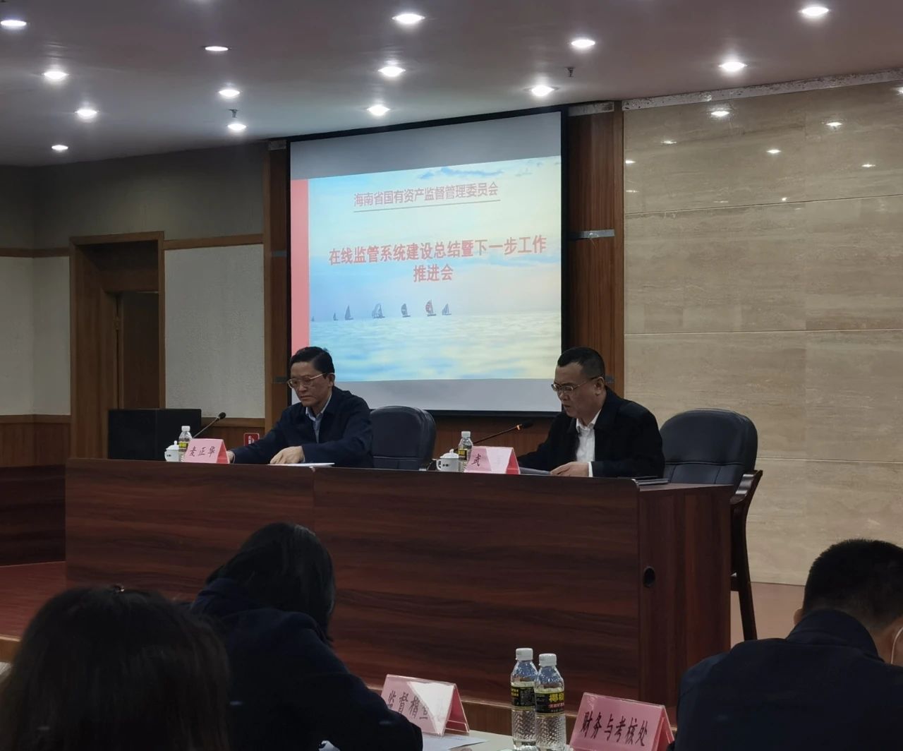会议分为三项议程,由在线监管系统的实施主体海南金垦赛博信息科技有限公司项目负责人王玉香汇报了海南省国资国企在线监管系统建设完情况及下一步重点工作任务;海南省发展控股有限公司、海南金林投资有限公司介绍系统建设的相关经验;麦正华副书记做总结讲话。