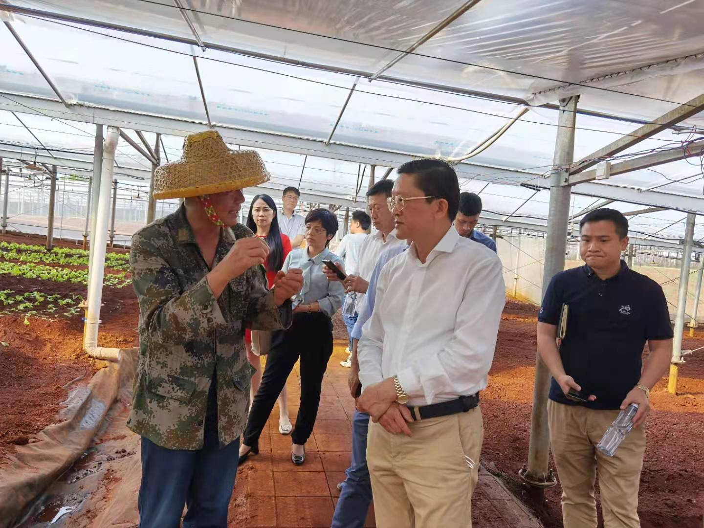 调研现场,信义光能(海口)有限公司项目建设负责人陈根介绍了信义光能与海口市菜篮子集团合作模式和农光互补光伏电站项目。蔬菜种植工作负责人万述明介绍了蔬菜种植情况。麦正华详细询问了项目成本收益、蔬菜产量等情况,对其综合效益表示肯定。