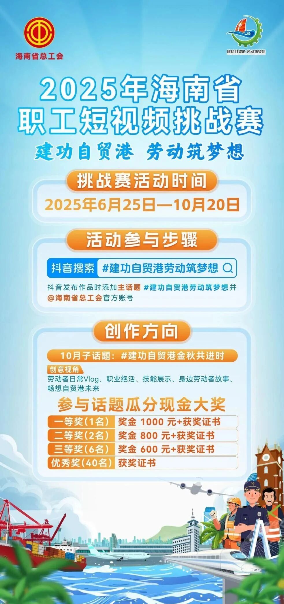 除此之外,海南省总工会邀您以四大创意视角参与短视频挑战赛:①用Vlog直击劳动者日常②炫职业绝活秀技能③讲述身边劳动者故事④畅想未来自贸港图景!均可加入主话题#建功自贸港劳动筑梦想活动,解锁千元奖金与荣誉证书!
