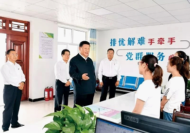 2019年8月19日至22日,中共中央总书记、国家主席、中央军委主席习近平在甘肃考察。这是21日上午,习近平在武威市古浪县黄花滩生态移民区富民新村党群服务中心考察。新华社记者谢环驰/摄