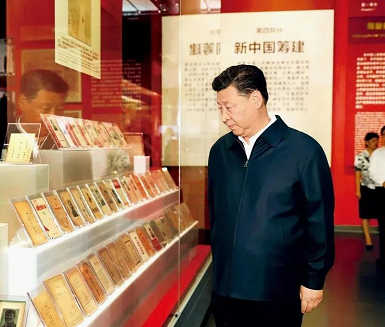 2019年9月12日,中共中央总书记、国家主席、中央军委主席习近平视察中共中央北京香山革命纪念地。这是习近平在香山革命纪念馆参观《为新中国奠基》主题展览。新华社记者黄敬文/摄
