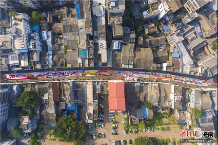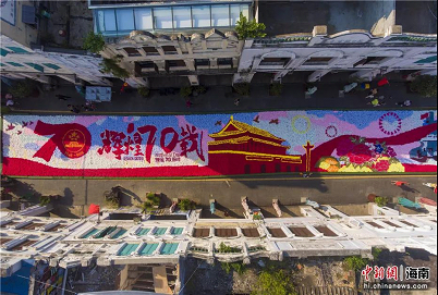 图为航拍210米国庆主题花卉亮相海口骑楼老街。骆云飞摄