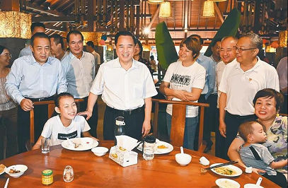 正值庆祝新中国成立70周年,海南各地洋溢着欢乐、祥和、喜庆的节日气氛。有着“中国历史文化名街”之称的海口骑楼老街热闹非凡,古色古香的南洋风格历史建筑,琼剧等非遗文化展演,各种“文艺范”十足的旅游商品店、餐厅、咖啡馆、艺术空间等店铺,加上国庆主题的歌舞快闪和街头艺术表演,吸引了大批游客。刘赐贵一行也加入欢乐的人群,与游客一起观看展演、亲切交流。刘赐贵指出,文化是旅游的灵魂,要打造更多具有文化内涵、彰显海南特色的旅游吸引物,大力推动文化消费。要规范旅游市场秩序,加强宣传推介,提升服务水平,加强市场监管,做好游客流量监测和引导,确保旅游市场秩序井然、运行平稳。