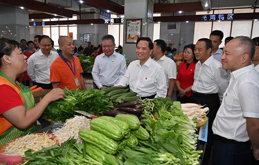 2019年10月1日,省委书记刘赐贵、省长沈晓明等领导在振兴农贸市场了解节日市场“菜篮子”的供应情况。海南日报记者王凯