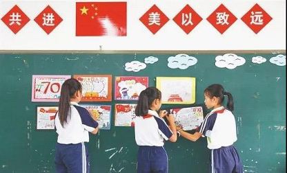9月25日,海口市第二十五小学学生们将国庆主题的手抄报贴在黑板上。