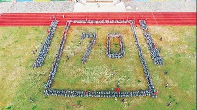 9月23日早上,在儋州市白马井中学的升国旗仪式中,新生们摆出“70”的造型,庆祝新中国成立70周年。