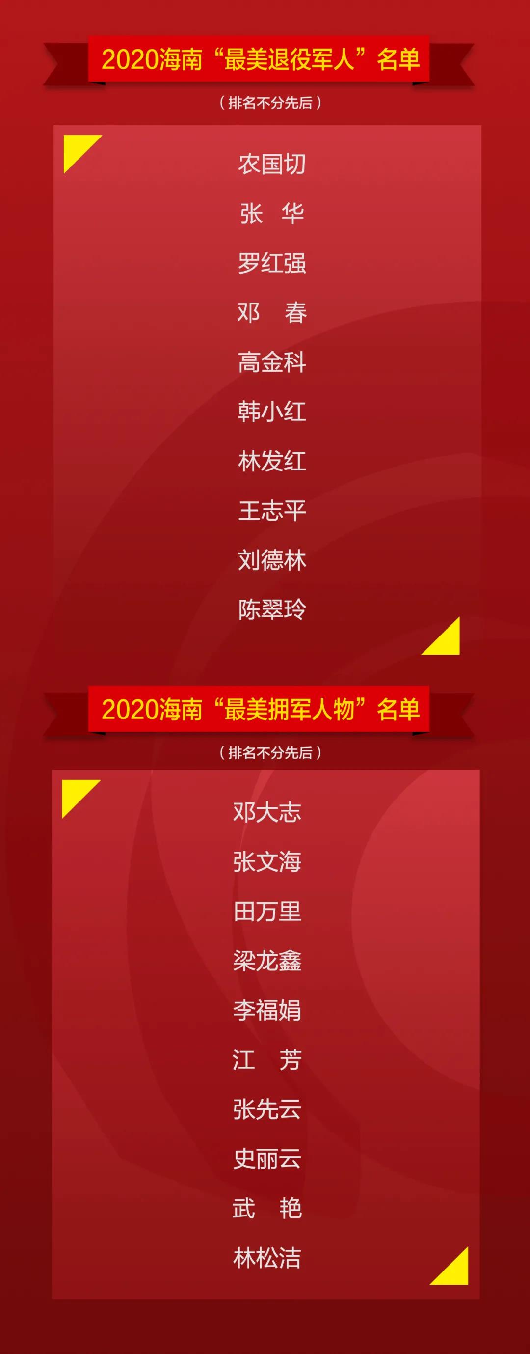 他们用脚步丈量大地,用汗水温润琼崖热土;他们扎根基层,带头致富;他们舍小家为大家,彰显责任担当。2月7日,2020年度海南10名“最美退役军人”、10名“最美拥军人物”在陵水县人民会堂正式发布。
