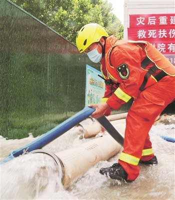 7月24日,郑州大学第一附属医院河医院区,救援人员进行排水作业。新华社记者 许雅楠 摄