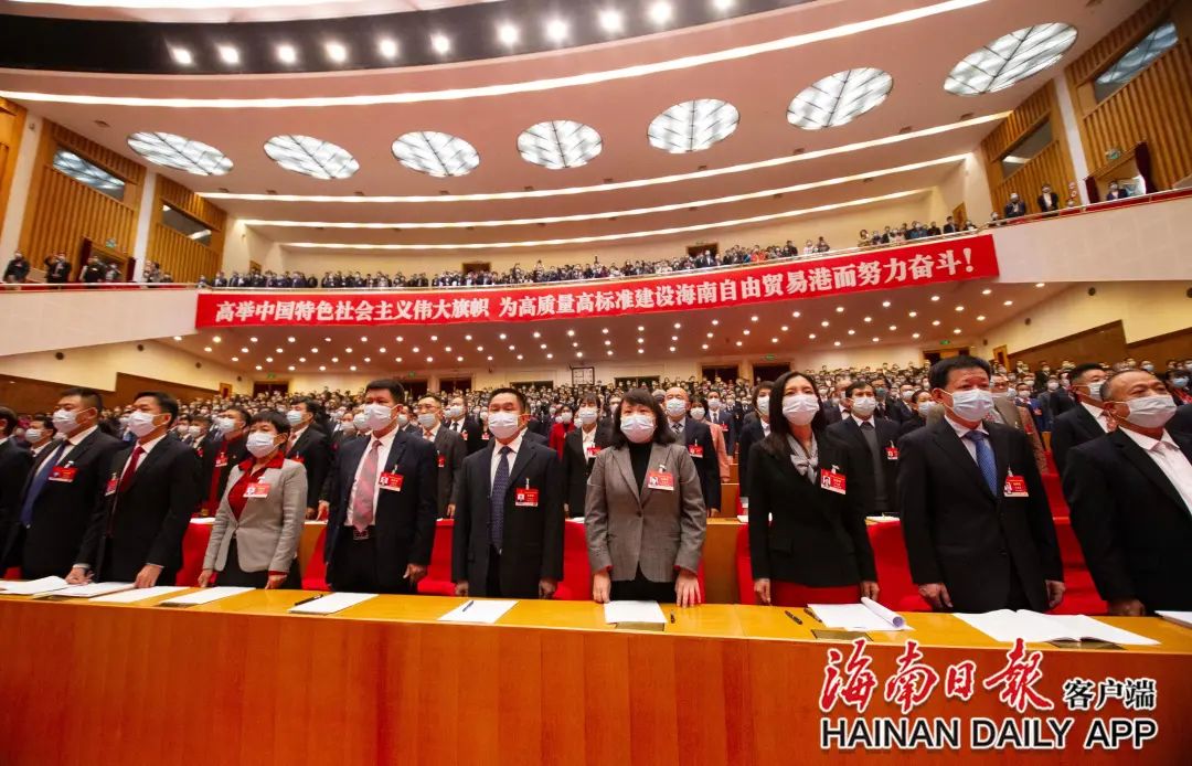省人大会堂内庄重简朴、气氛热烈,主席台帷幕正中的国徽在鲜艳的红旗映衬下熠熠生辉。会场中“高举中国特色社会主义伟大旗帜,为高质量高标准建设海南自由贸易港而努力奋斗”的大幅标语鼓舞人心、催人奋进。