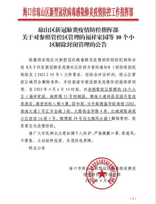 4月6日,海口市琼山区新冠肺炎疫情防控指挥部发布关于对参照管控区管理的福祥家园等10个小区解除封闭管理的公告。