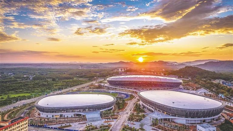 航拍儋州市“一场两馆”体育中心,气势恢宏,独具特色。特约记者 吴文生 摄