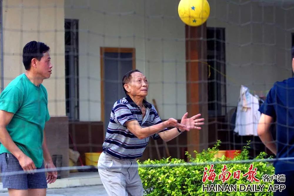 2004年3月29日下午,在海南三亚国家杂交水稻工程技术研究中心海南基地大院里,袁隆平与助手们打排球。海南日报记者 张杰 摄