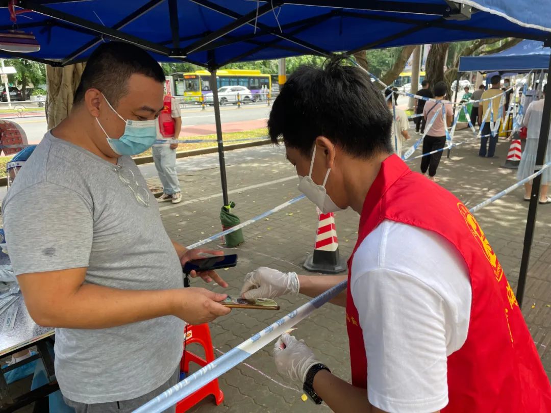 美兰区海府路银都大厦采样点,志愿者正在为采样的市民发放贴贴。请每一位市民自觉参加核酸检测