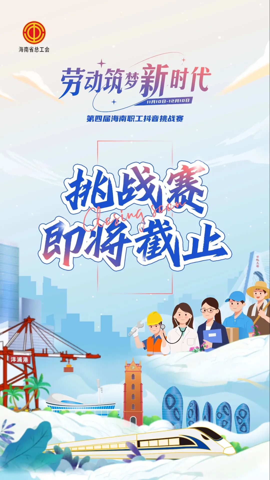 为深入学习贯彻党的二十大精神,大力弘扬劳模精神、劳动精神、工匠精神,结合省委“能力提升建设年”暨深化拓展“查堵点、破难题、促发展”活动,海南省总工会于11月10日至12月10日开展第四届海南职工抖音挑战赛,发挥新媒体的传播优势,在全省广大职工群众进一步掀起学习宣传贯彻党的二十大精神热潮,引领职工群众听党话、跟党走,加快建设具有世界影响力的中国特色自由贸易港。