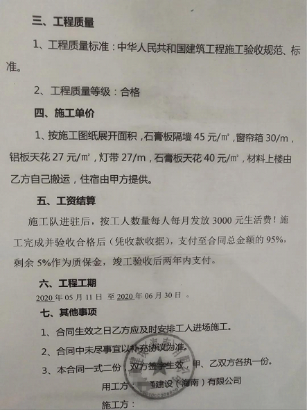 原来疫情期间,三亚阳光金融大厦内某装饰工程施工单位邀请他们承包木工工程和吊顶工程,并与该公司签订了用工合同,约定了施工单价。5月11日按约定进场施工,工程尚在进行中,6月1日被口头告知因施工质量问题停止施工,并退出施工现场。当事农民工被迫退出施工后,由于存在质量问题、工程量核定、返工损失、材料损失等纠纷,无法进行结算,也无处安身,心情十分焦虑,遂与施工单位发生了激烈争执,相持不下之时,有关部门提出,先找工会调解,调解不成再走法律途径。当事农民工不知所措之时,抱着试一试的态度来到了市总工会,希望我会能维护好他们的合法权益,尽快得到工资,解除他们的生活困境。