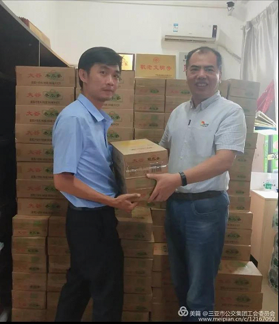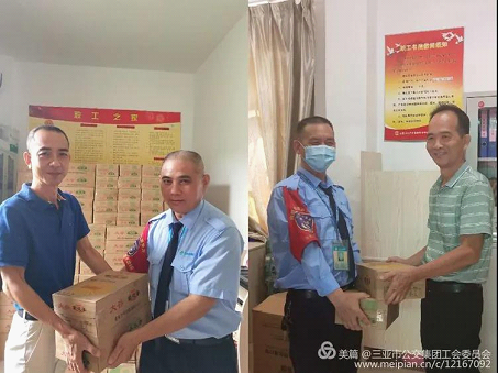 图为三亚公交集团工会陈主席和卢副主席给职工发放福利品