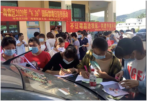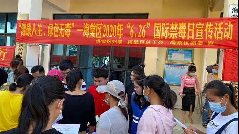 根据三亚市总工会《关于开展2020年全民禁毒宣传月主题活动的通知》和海棠区禁毒委关于印发《2020年三亚市海棠区全民禁毒宣传月实施方案的通知》(海禁毒委﹝2020﹞6号)文件要求,6月22日上午,区总工会联合区妇联、团区委在青田风情小镇开展“健康人生·绿色无毒”进社区宣传活动。