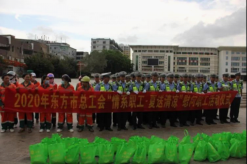 活动首先由陈永发同志致辞,他指出按照省总防暑降温工作要求,开展送清凉活动就是为了关爱职工,平安度夏。目前正值东方市开展“三创”工作,广大一线职工们冒着炎炎夏日做出了很大的贡献,在此表示亲切的慰问和衷心的感谢,希望大家工作的时候,注意防暑降温,做好个人防护措施,同时鼓励劳动者们再接再厉,按照省总和市委的工作要求,发扬吃苦耐劳、不讲条件、无私奉献的劳动精神,继续发挥工人阶级主力军作用,为东方建设成为宜居宜业宜游的国际滨海公园城市作出新的贡献。