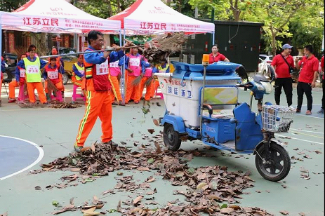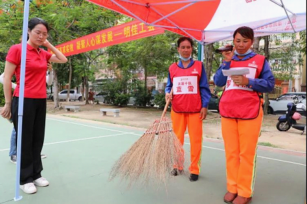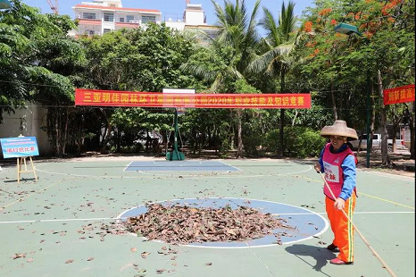 开幕式结束后的第一项比赛是绑扫把比赛,要求所有选手在6分钟内将扫把草和竹竿编成扫把,并清扫完指定的区域,最后由评委对完成时间、扫把美观度、结实度、实用性进行综合评分。项目主持人吴火毅宣布了比赛规则之后,选手们就正式进入比赛项目,经过一番激烈的角逐,吉阳区域罗小香以5分46秒的优异成绩获得了第一名。比赛选手绑扫把的娴熟技能和扫地时的熟练程度,让围观的群众啧啧称叹,并向她们竖起了大拇指!