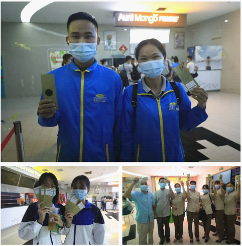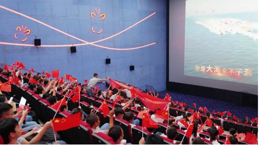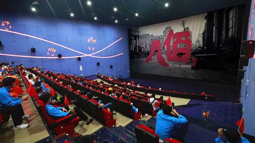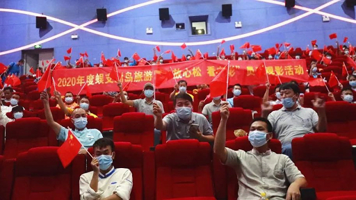 蜈支洲岛近1400名职工下班后分批次到电影院观看电影《八佰》。入场前,职工有序测量体温;观影期间,职工均全程佩戴口罩,隔排隔行坐。