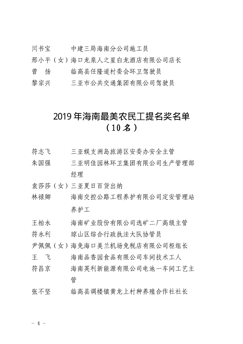 关于通报表扬2019年海南最美农民工的决定(琼工联〔2019〕23 号)